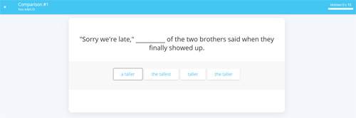 Každá otázka má nastaveno, pro jakou je určena úroveň a na jaký jev či jaké jevy se zaměřuje. Aplikace umí sama testy sestavit podle požadovaných kritérií. V každém případě vždy respektuje úroveň uživatele. Může pro vás tedy na míru sestavit např. náhodný test zaměřený na gramatiku, slovní zásobu nebo obojí. Může ale také sestavit třeba pouze test na používání členů, místních předložek, předpřítomného času, frázových sloves apod.